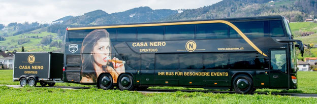 Ganz einfach: weil wir aus dem Rheintal kommen und wissen, wie man in der Ostschweiz und darüber hinaus feiert. Unser Casa Nero Eventbus ist nicht einfach nur ein Bus, er ist eine rollende Lounge mit zwei Etagen, Bar, Bluetooth-Boxen und Platz für bis zu 60 Gäste.